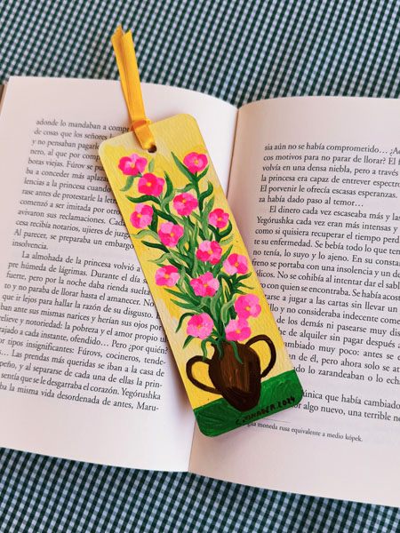 Señalador pintado en ambos lados con acrílico y barnizado, sobre papel poroso especial para pintura.